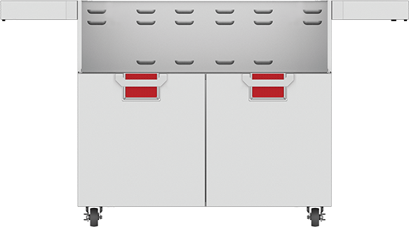 This grill-ready cart matches the 42” built-in grill in heavy-duty form and function. Fold-down side shelves offer extra work space when you need it. The two-door design allows easy access to gas tank and grilling tools. Commercial-grade casters deliver easy maneuverability.