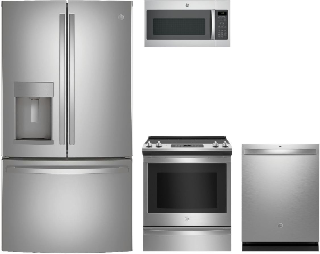GE® 4 Piece Stainless Steel Kitchen Package with French Door Refrigerator, Slide In Electric Convection Range, Built In Dishwasher, and Over The Range MicrowaveRead More