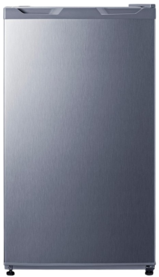 Unit has a stainless steel-like silver finish with a vertical grain on the door.