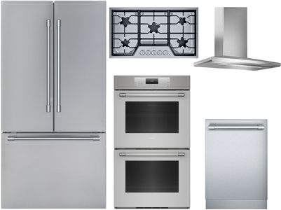 Thermador® 5 Piece Stainless Steel Kitchen Package with a french door refrigerator, built in dishwasher, gas cooktop, electric double wall oven and wall hood.Read More