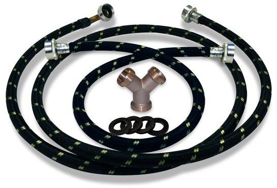 The Premium Hose Kit is designed for use on a steam dryer. The 90-degree elbow saves space and helps prevent kinking and the dependable crimp is the industry’s most reliable against leakage. The premium hoses have a braided polyester reinforced layer for added strength and durability, EPDM rubber hose for resistance and long life, and a braided nylon shielding bonded to the hose for added protection. The kit includes 5-foot and 2- foot hoses, brass Y connector, and five rubber washers. Fits any brand. Five year guarantee.